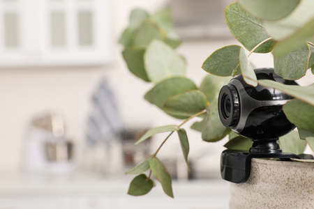 Spy camera hidden in flower pot indoors, closeup. Space for text
