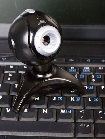 close-up web camera staying at laptop keyboard