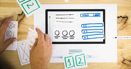 UX Graphic designer creative sketch and planning prototype wireframe for web mobile phone. Application development and user experience concept