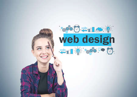 Smiling teen girl wearing a checkered shirt and holding a pen. A gray wall background with a web design sketch.
