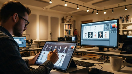 A creative professional engages in digital design on a tablet using a stylus, showcasing a modern workspace filled with art and innovation tools for graphic projects.