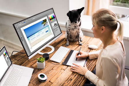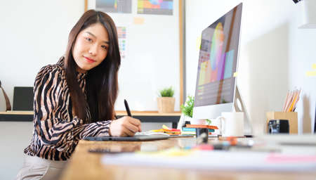 Female graphic designer working on computer while using graphic tablet at her work space.