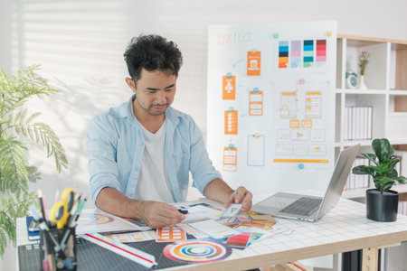 A designer is working on a creative UX UI project at a desk, arranging color palettes and layout templates with focus and precision, representing modern design and innovation.