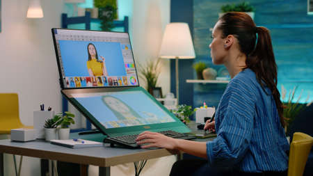 Freelancer retoucher woman working overtime on laptop computer with photo editing software. Graphic editor retouching photos of a client on performance pc before deadline