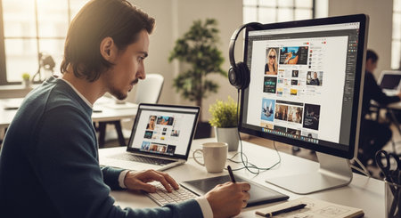 Graphic Web Designer Using Multiple Monitors Desktop Computer