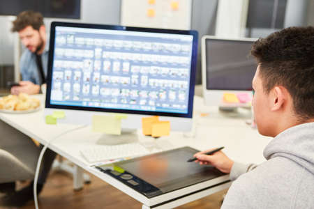 Young man as graphic designer on tablet computer designing a website
