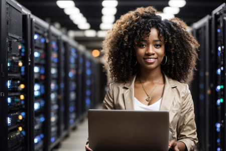 Beautiful Young African Woman with Curly Hair Using Laptop in Server Room. Young African Woman with Curly Hair Working on Laptop in Server Room.