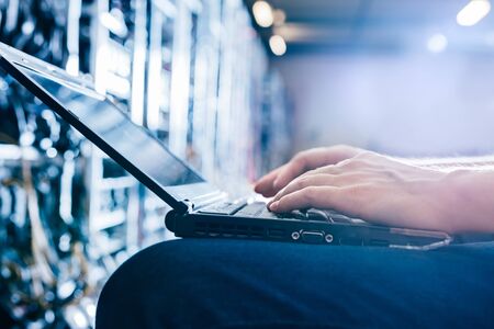IT specialist working on computer in bitcoin and crypto currency mining farm. Big data center. High tech server computers at work