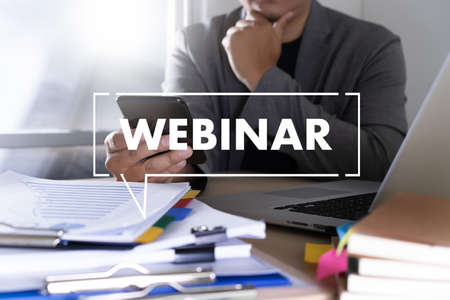 WEBINAR man hand on table Business, coffee, Split tone WEBINAR phone