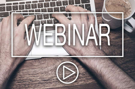 word WEBINAR and play button against hands of man working on laptop computer, e-learning concept