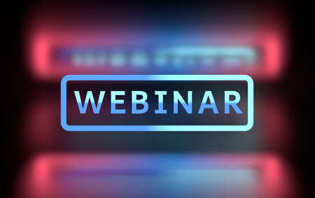 Single large bold word - Webinar - written in bold glowing neon pink and blue light on reflective background. 3d illustration.
