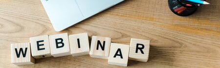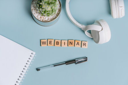Top view of a blue surface with wooden letters, the word webinar is laid out, flat lay with a notebook and headphones