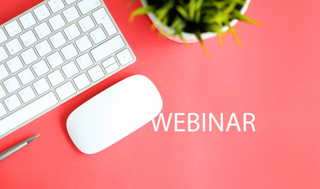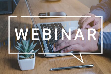 Webinar, Hands-on Table Use E-business Connection on Computer, Man Working From Home Participating in Online Group Communication WEBINAR