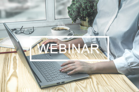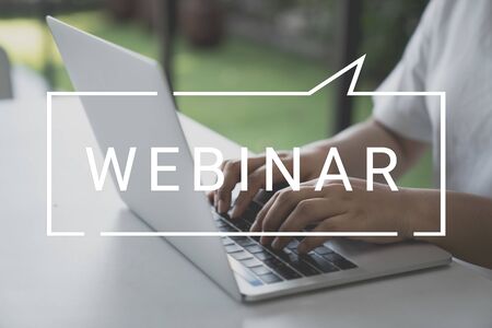 A guy hands typing on a laptop with an online conference screen in the background, café interior. Creative graphic for online education with white webinar lettering above a lady working on a computer.