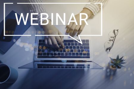 WEBINAR hand on table use E-business Browsing Connection in computer, coffee, Split tone