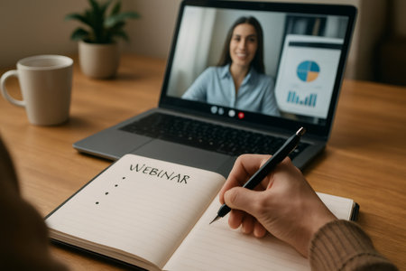 Closeup of hand writing notes on notebook during an online webinar with female speaker showing charts on laptop screen