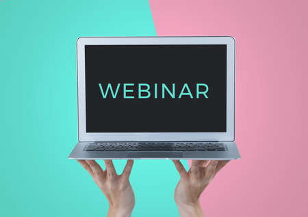 Composition of webinar text on screen of laptop held by hands, on turquoise and pink background. seminar design template concept digitally generated image.