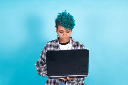 Portrait of young adult Caucasian woman with shaved head sitting at desk using laptop, hand on keyboard, focused expression, illuminated by blue and orange light, plastic sheet background