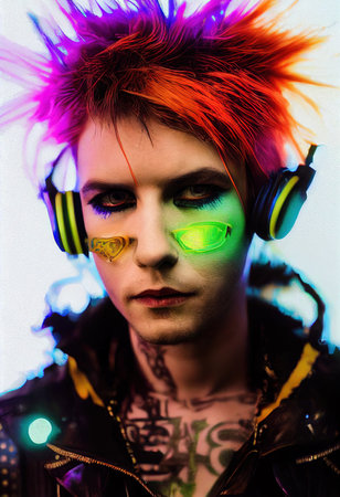 Portrait of a boy with punk hairstyle and colorful makeup.