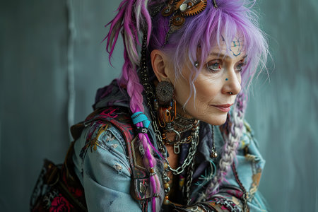 Mature punk woman. Portrait of elderly female with bright image, daring style. Generative AI