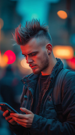 Portrait of a punk man in a leather jacket with a punk haircut.