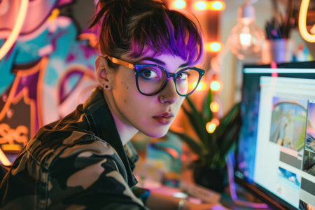 Young woman with bright appearance. Portrait of fashionable female with vivid image, style.