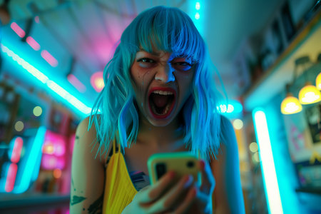 Edgy individual with vibrant blue hair and headphones against graffiti wall