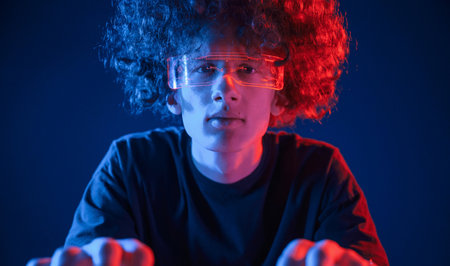 Gamer is focused by playing. Young man with curly hair is indoors illuminated by neon lighting.