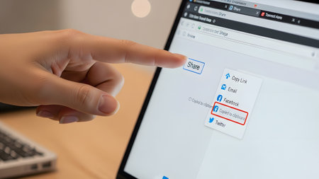 A finger taps the 'copied to clipboard' option within a share menu on a laptop screen.