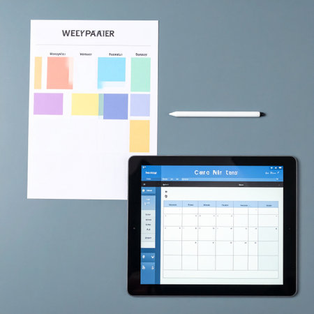 An organized workspace displays a planner, smartphone, clock, glasses, and decorative items. The composition features neutral tones with contrasting objects, captured from above with balanced lighting. Suitable for articles or websites related to productivity, time management or business planning. The scene suggests a modern office.