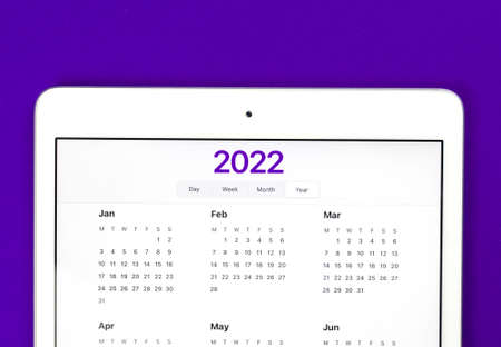 Calendar 2022 on the screen. Bright flat lay background, to do goals and planning for new year concept. Top view