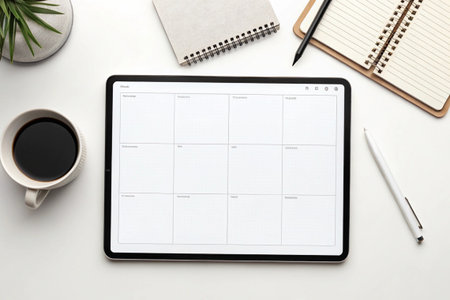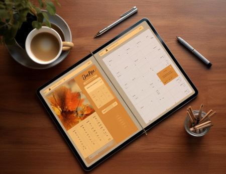 An open planner with a yellow pencil and a cup of coffee on a wooden desk. The composition features a top-down perspective, with the planner open to a monthly calendar layout. Neutral tones and soft lighting characterize the scene. This image is suitable for various commercial uses, including website content and marketing materials.