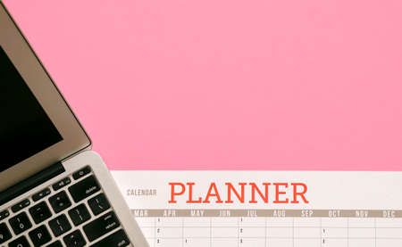 Calendar planner and computer laptop on top of pink table top. Flat lay.