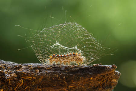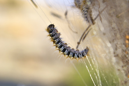 Close up of caterpillars on a spider web. Macro.