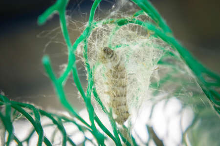 silkworm on mulberry leaf , worm larvae ,eating mulberry leaf , And pods are pupae