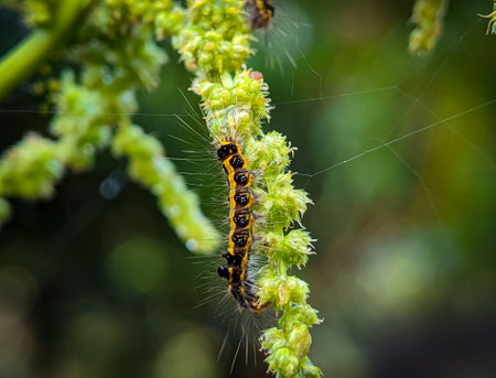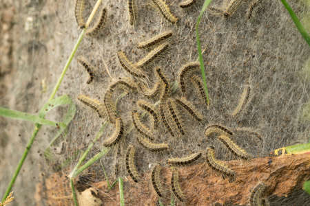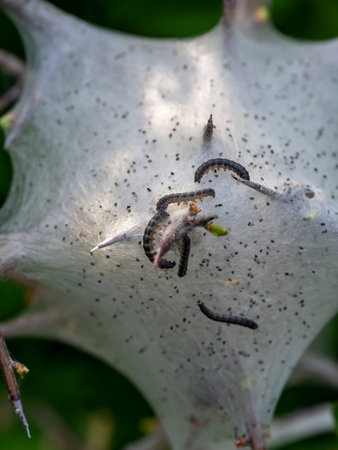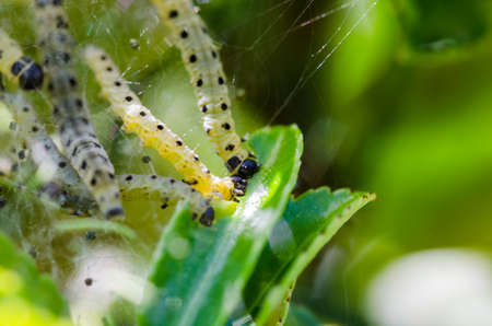 Closeup of a pest larvae caterpillars, forming communal webs around green leaves.