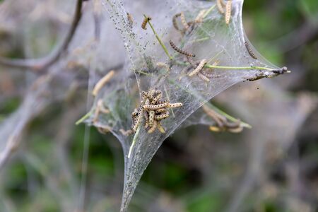 Nesting web of ermine moth caterpillars, yponomeutidae, feeding on the leaves of a tree