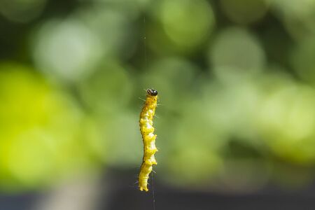 Worm caterpillar Pulling a web, Caterpillar hanging on silk thread.