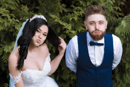Amazing smiling wedding couple. Pretty bride and stylish groom.
