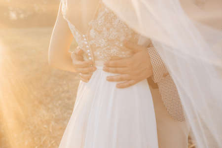Happy bride and groom embracing in the field at sunset. Bride holding bouquet of flowers.