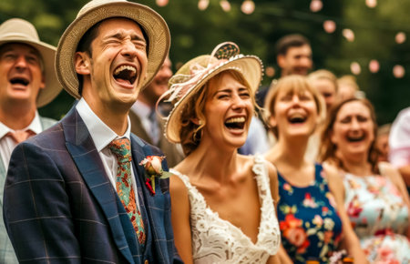A happy young couple is smiling and celebrating their wedding day surrounded by guests while being showered with confetti. The groom wears an elegant pastel blue suit, bow tie, and has short hair styled in a quiff. He holds the bride's hand as they smile at each other, surrounded by blurred people cheering them on. A bouquet of flowers floats nearby. --ar 53:30 --v 6.1 Job ID: 88442b6a-7d9c-45e9-848c-3b39c9b99bcf
