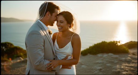 A tender moment of a newlywed couple embracing and smiling at each other, with a serene sea and sunset background, conveying love and happiness.