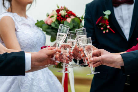 Close up of a glass of red wine in the hands of the bride dressed in a white dress outdoors.