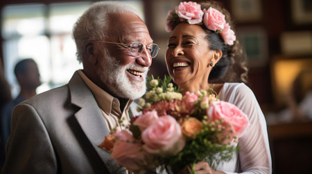 Autumn or fall wedding day photo of an elderly black couple. A portrait of senior bride and groom in festive clothing with flowers. People in love are outdoors in autumn landscape