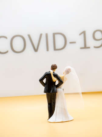 Figure of a wedding couple standing in front of a large lettering with covid 19 and celebrating alone without party guests. Vertical