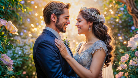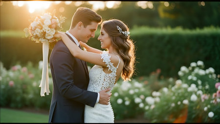 A tender moment between a bride and groom in a beautiful garden, surrounded by flowers, with warm sunset light casting a romantic glow on their faces and elegant wedding attire.
