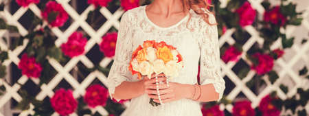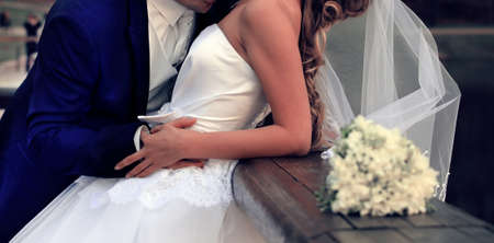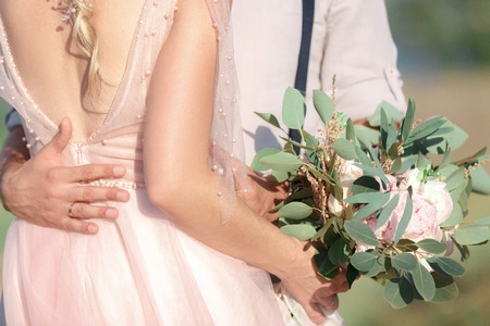 Hands of the bride and groom with wedding bouquet