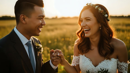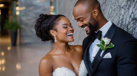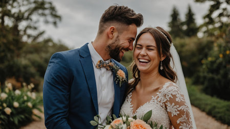 A joyful moment of bride and groom laughing together, celebrating love