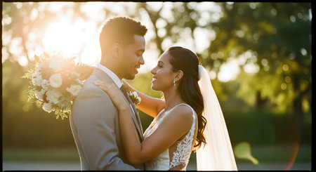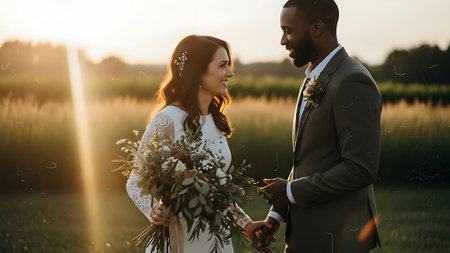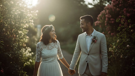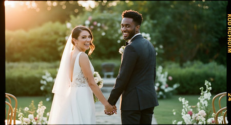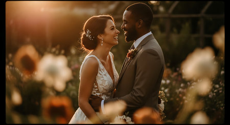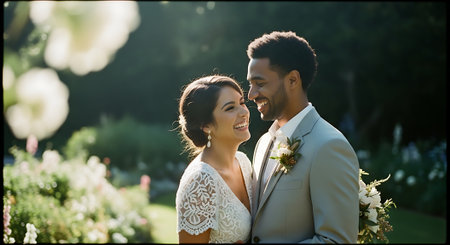 A joyful multiracial newlywed couple stands hand in hand, surrounded by lush greenery and vibrant flowers, with the warm sunlight shining down on them.