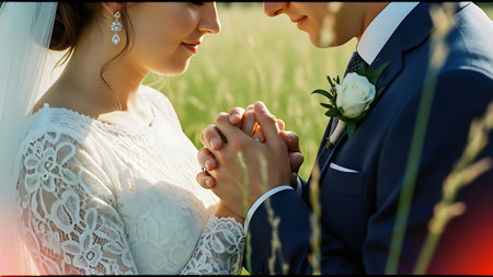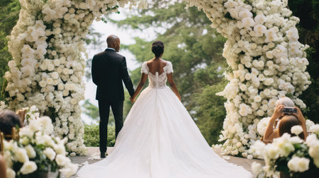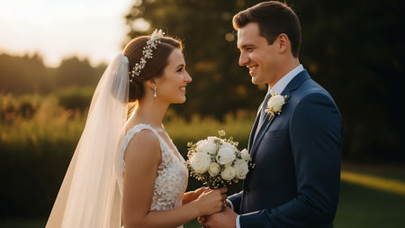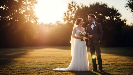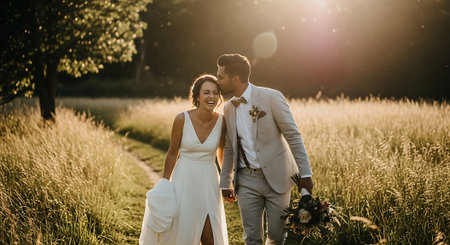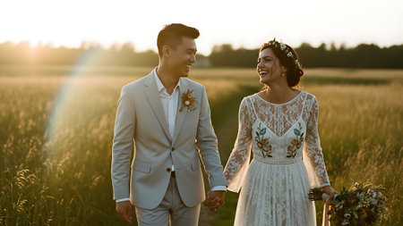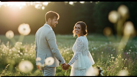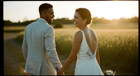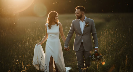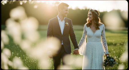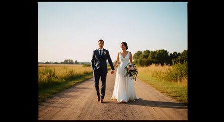 A newly married couple, a man in a black suit and a woman in a white gown, walk hand in hand. The scene evokes love, commitment, and celebration on their special day, with soft lighting and an intimate feel.